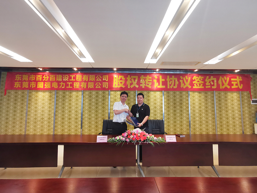 2019年11月5日,东莞市百分百建设工程有限公司(以下简称“百分百建设”)对东莞市图强电力工程有限公司(以下简称“图强”)的股权收购仪式顺利举行,倍增平台执行层领导匡爱斌匡总、危建明危总出席仪式,并代表百分百建设与图强电力签订合作协议,签约仪式在和谐融洽的氛围中圆满结束。